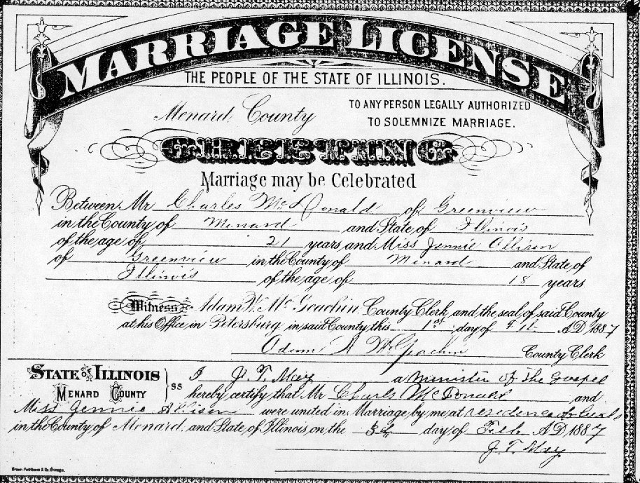 Charles and Jennie were married on 3 February 1887 in Menard County, Illinois. Charles was 22 while Jennie was 17. A copy of their marriage license is below: