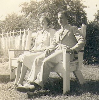 At the right is a photograph of Jo and Don on the day they announced their marriage. It was taken in the backyard of Don’s parents’ home at 839 North Kansas Avenue in Hastings, Nebraska. Don’s father — George Edwin Overturf — had built the bench heavy enough so that even he could sit on it. There were numerous photographs taken of them sitting on this bench.