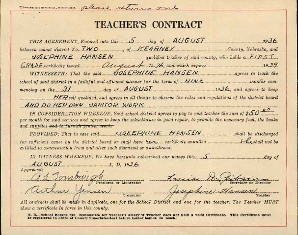 Jo felt there was nothing else she could do but leave and teach for a year, earning enough money to get her through the next year of school. She taught grades one through four for a year in a small school in Lowell, Nebraska while Don continued his education at Hastings College. This was the 1936-37 school year. Jo apparently had at least one other suitor, but not as persistent or as serious as Don; she even kept a couple of this young man's letters her entire life.