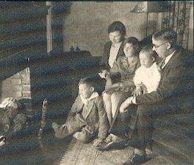 My maternal grandfather — Hans Lloyd Hansen — was born in Minden, Nebraska, in 1894. His wife — Estella Mary Mahoney — was born in Heartwell, Nebraska just a year later. They met in high school and married in 1915. They moved to Hastings, Nebraska shortly thereafter and began a family. In the photograph at the right, they posed for a Christmas card. From left to right: Bill, Stella, Jo (my mother), Jim, and Lloyd.