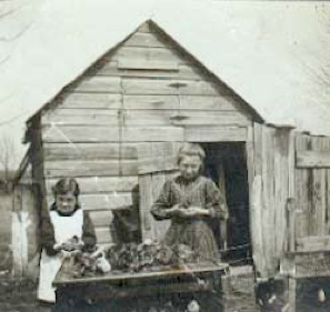 My grandmother — Estella Mary Mahoney — was born on a farm in Heartwell, Nebraska, the daughter of Michael James Mahoney and Josephine Amanda Porter. Stella was always very proud of her Irish heritage and of her childhood growing up on a Nebraska farm. In the photograph at the left, Stella is about 10 years old (she is the girl at the right). The other girl may have been her sister, Freda, as she had only one sister and five brothers. A closer look at the photograph will show you that there are many chickens on the stand in front of the girls. You can learn more about Stella and her life by clicking on her name at the beginning of this paragraph.